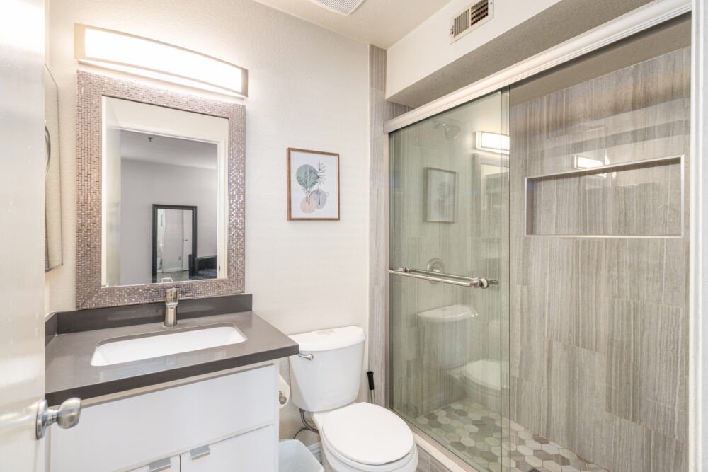 Rest comfortably in one of our three thoughtfully designed bedrooms, each equipped with a desk, chair, nightstands, closet with luggage rack, hangers, fan, and a plush throw. The main bedroom suite boasts a queen bed and an updated walk-in shower. The second bedroom includes both a queen bed and a full bed, while the third bedroom has another queen bed. These bedrooms share a hallway bathroom with a tub. For your convenience, a washer and dryer are provided, along with a starter set of toiletries, basic cleaning supplies, hair dryers, a drying rack, iron, and ironing board.