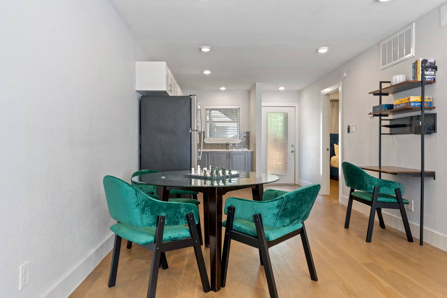 The charming dining area can be found in-between the kitchen and living area.