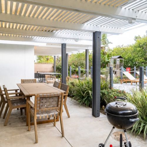 - Outdoor seating, BBQ grill, and firepit