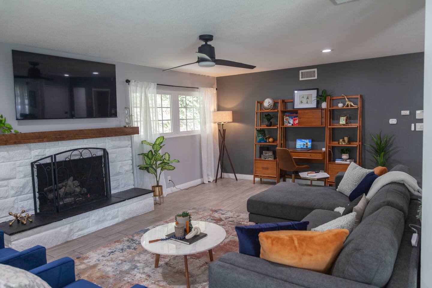 *The 65 in television is on a swivel wall mount above the fireplace, it can be viewed from the living room, dining room and kitchen. Watch a movie on the couch or listen to music while cooking a home cooked meal in the kitchen.