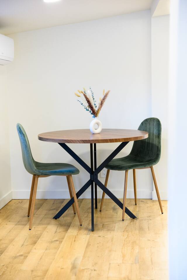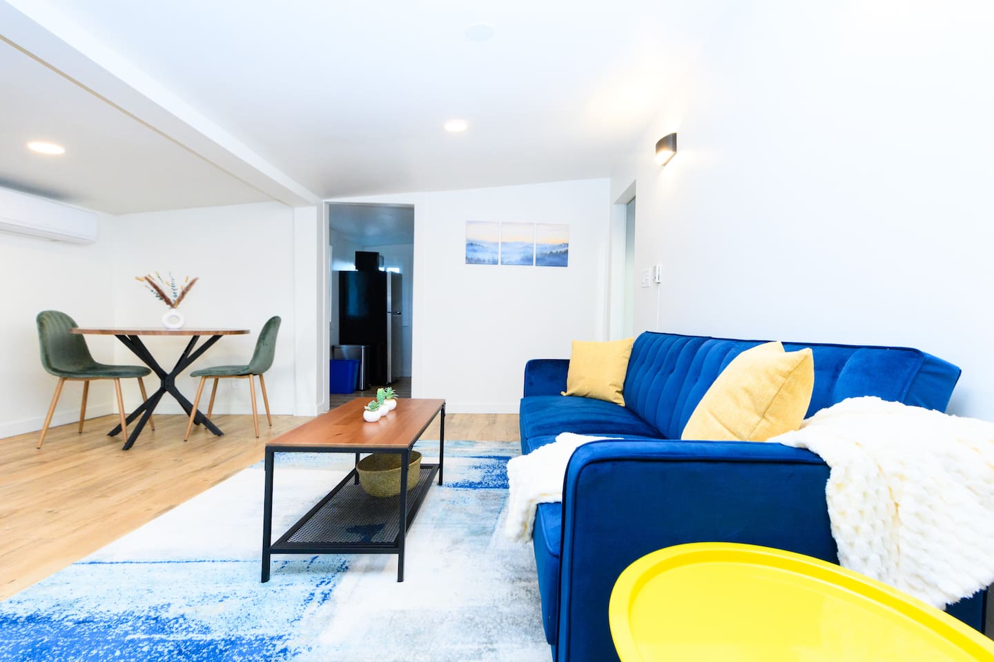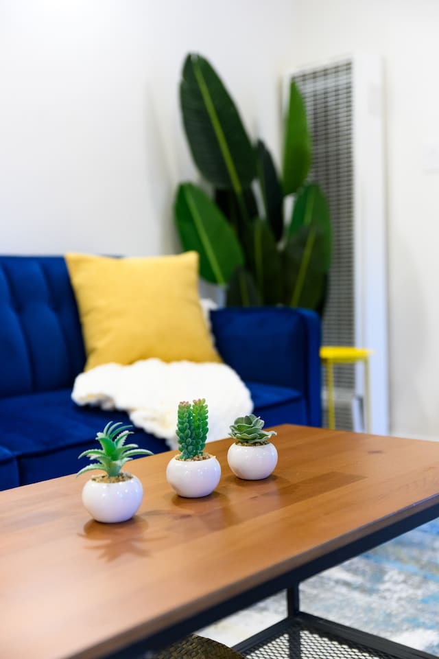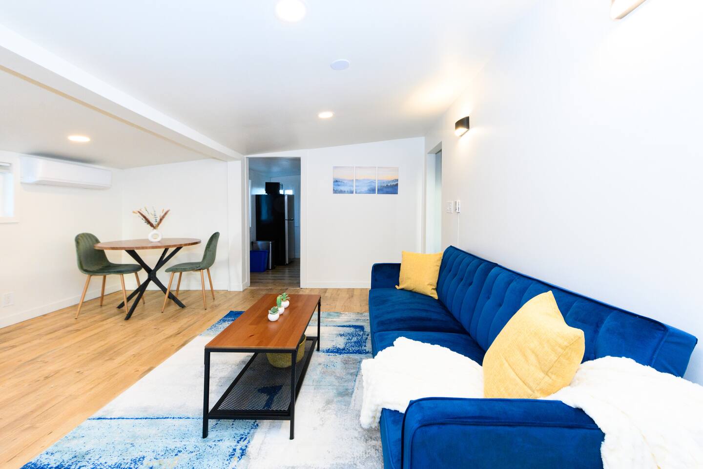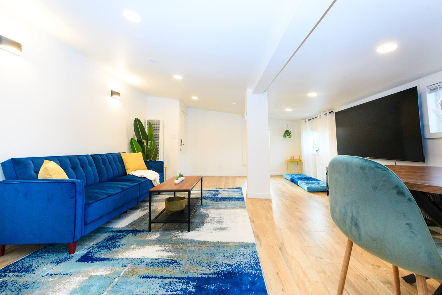 Upon entering, guests are greeted by a spacious yet cozy living space, thoughtfully designed with clean lines and a minimalist, clean aesthetic. The living room includes a large TV for your entertainment. To enable your peaceful nights of sleep, this home includes 2 plush queen beds, and a chic futon couch that effortlessly transitions from seating to sleeping space. In addition, washer and dryer are available in the unit (free of charge).