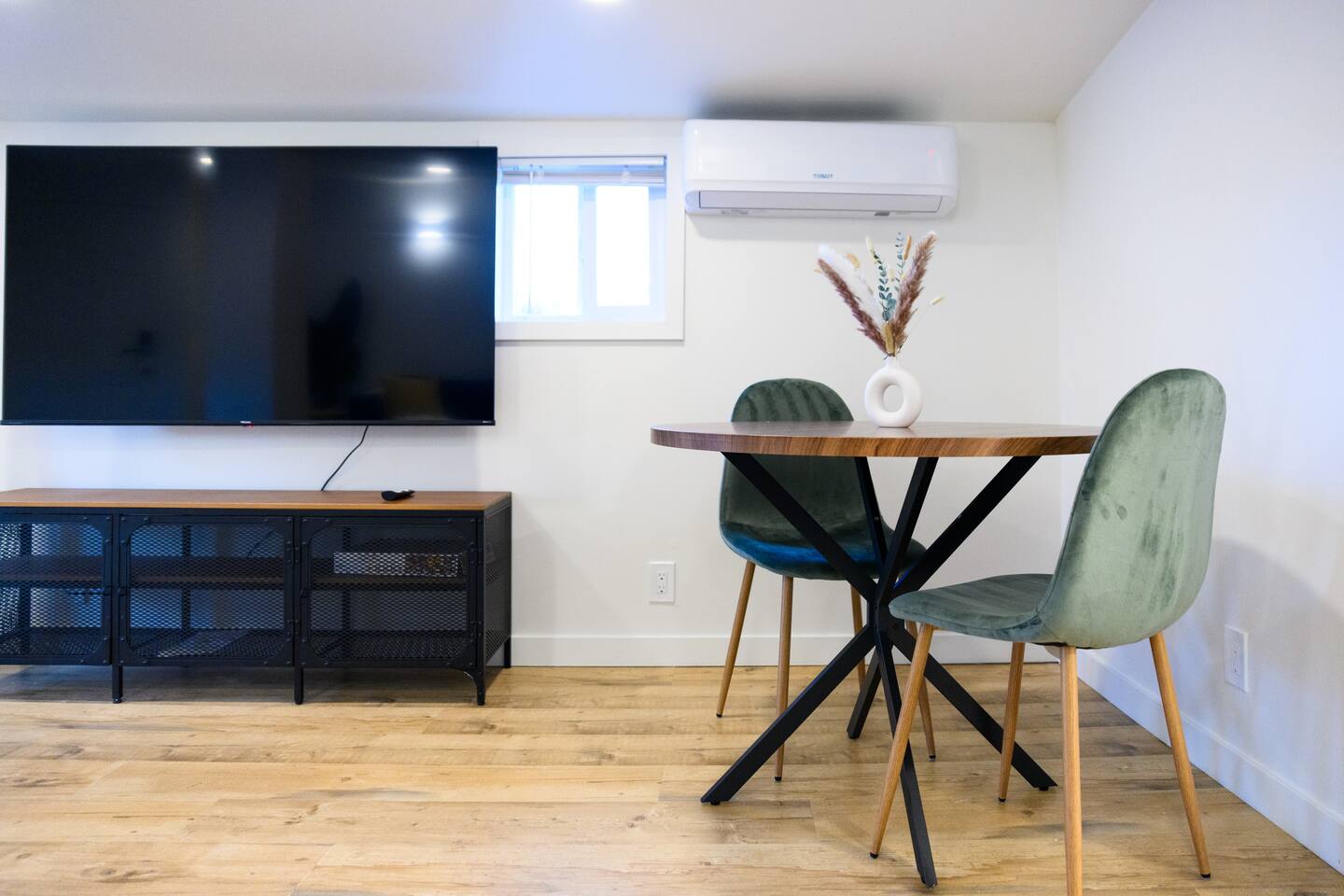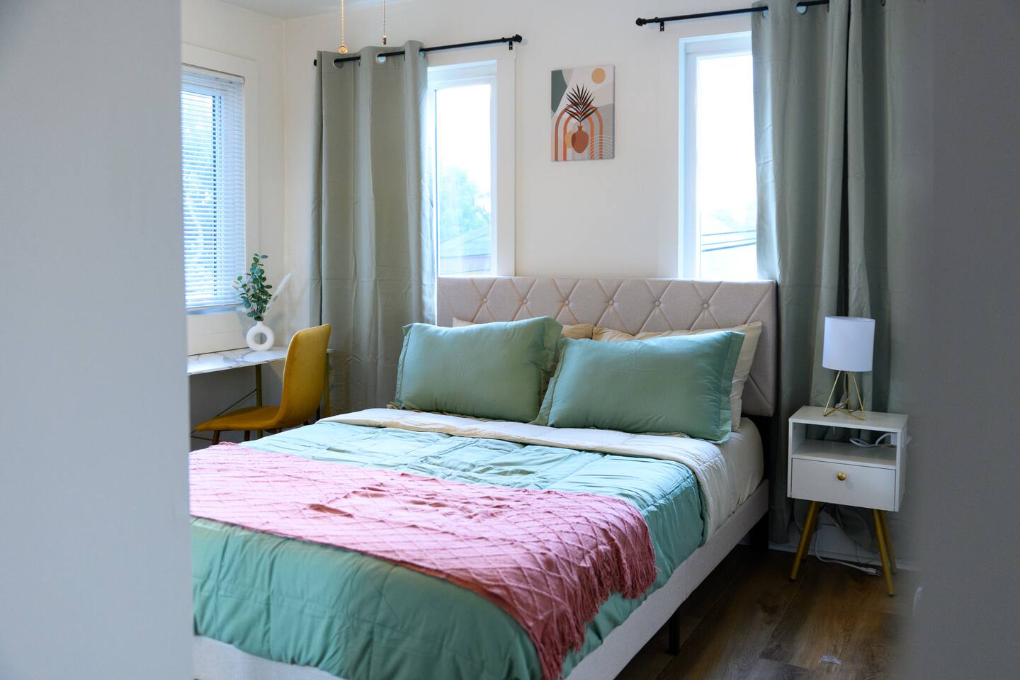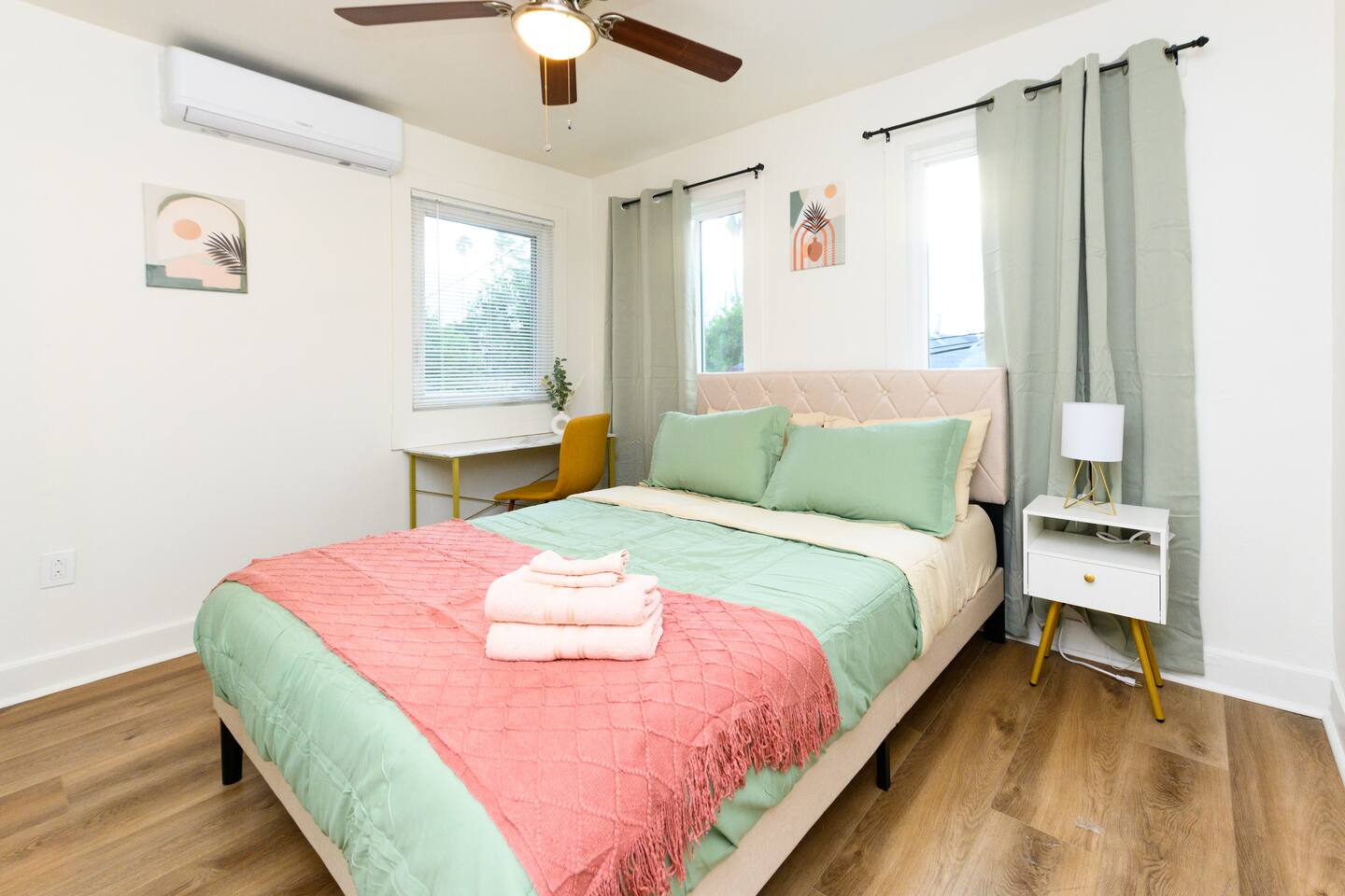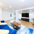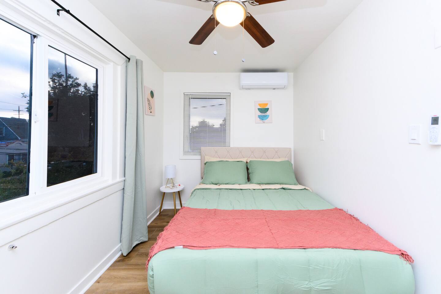 Upon entering, guests are greeted by a spacious yet cozy living space, thoughtfully designed with clean lines and a minimalist, clean aesthetic. The living room includes a large TV for your entertainment. To enable your peaceful nights of sleep, this home includes 2 plush queen beds, and a chic futon couch that effortlessly transitions from seating to sleeping space. In addition, washer and dryer are available in the unit (free of charge).