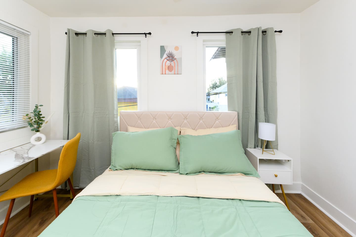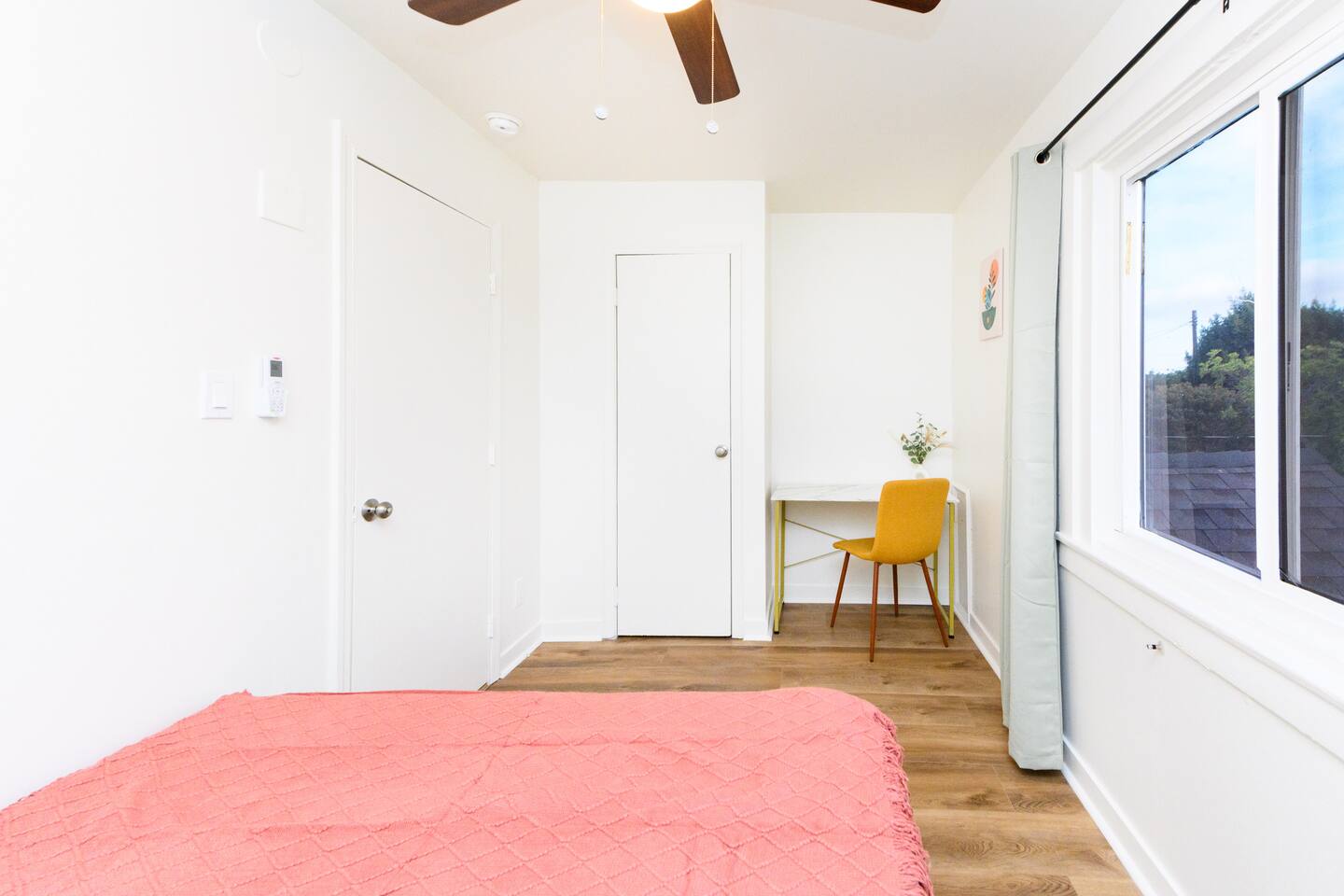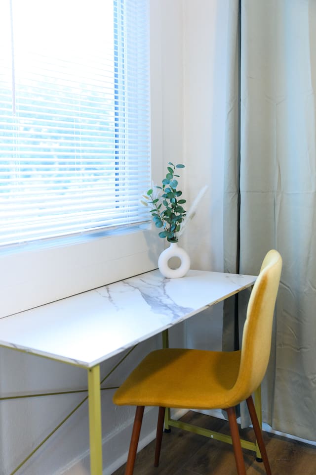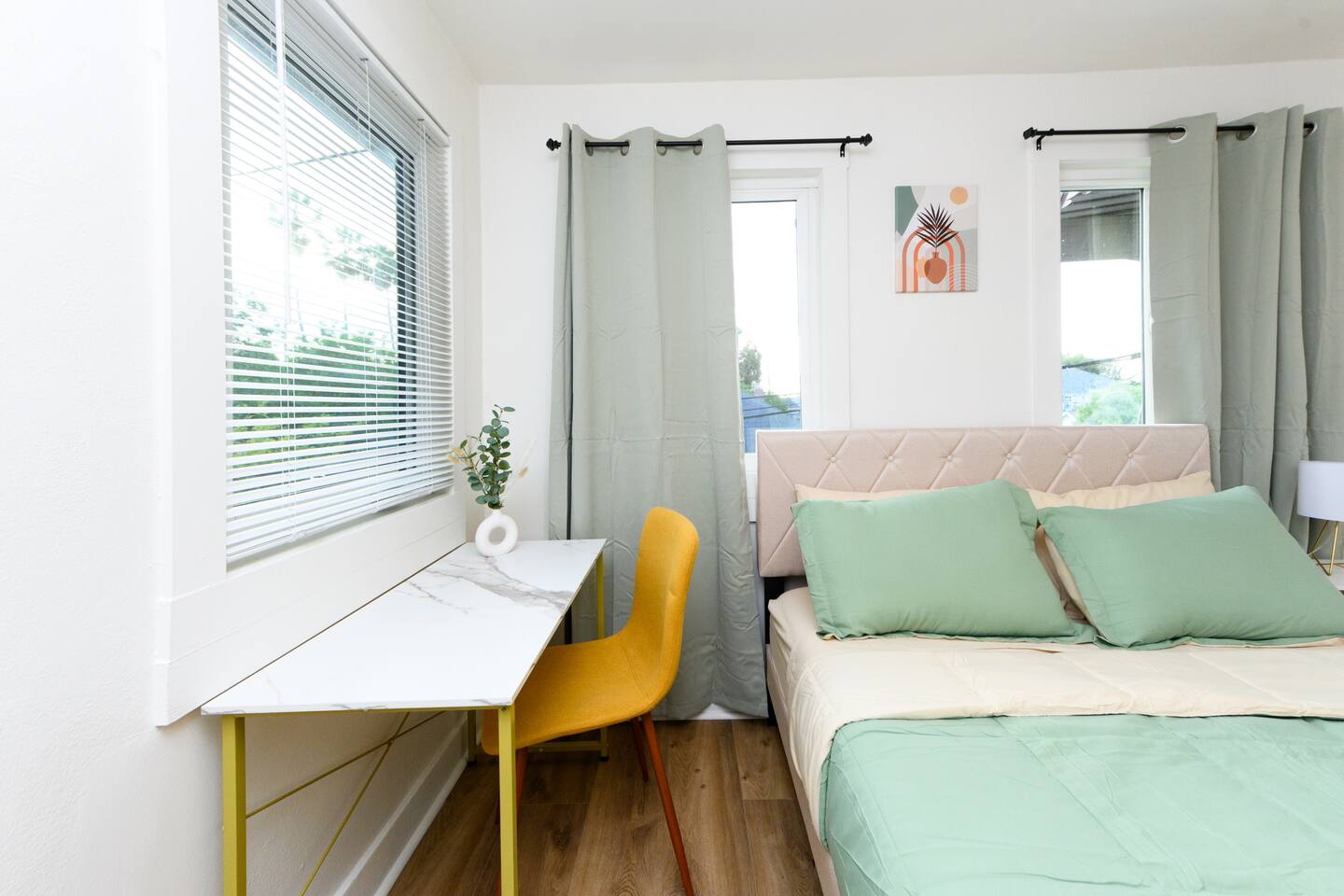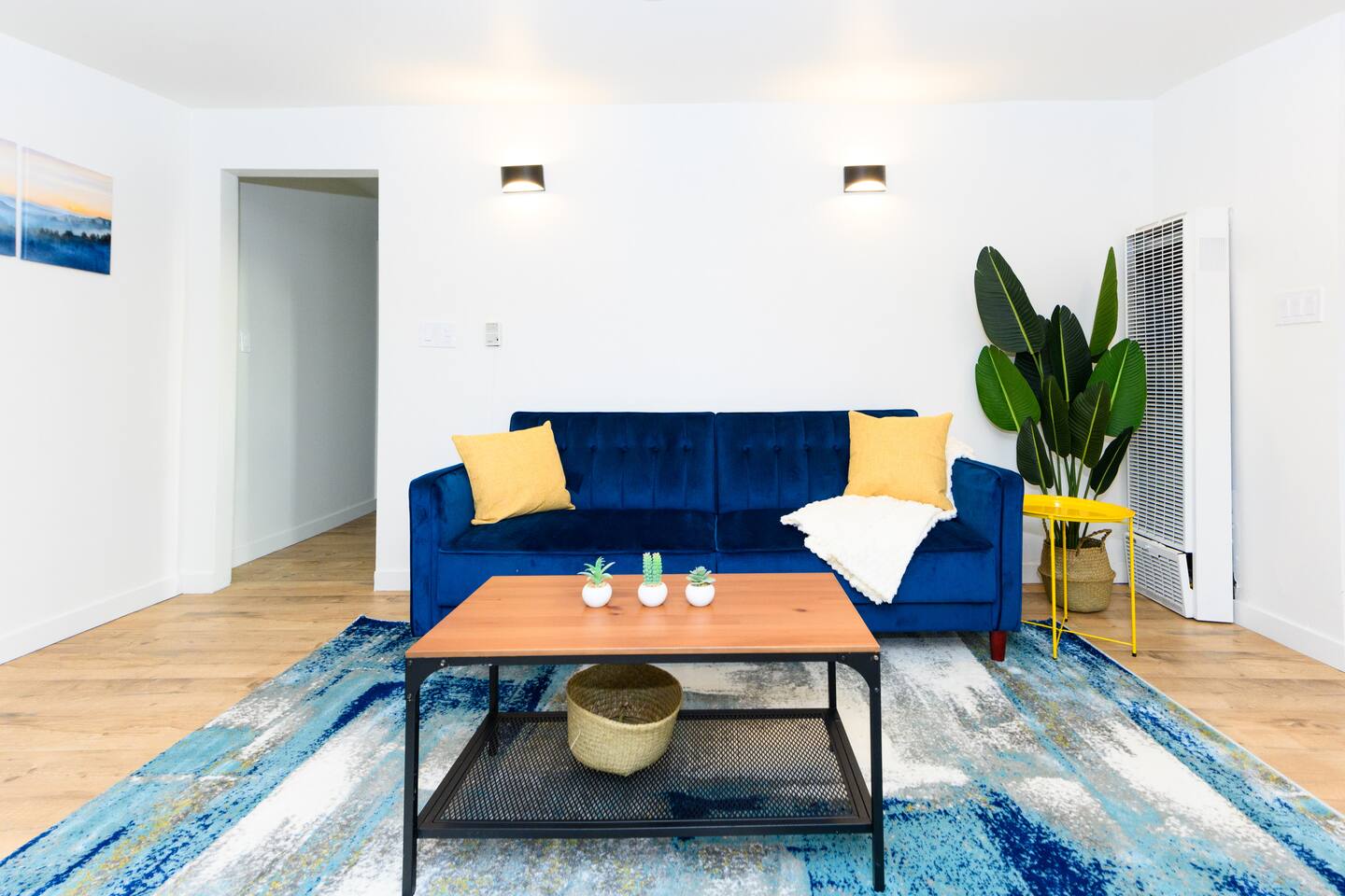 Upon entering, guests are greeted by a spacious yet cozy living space, thoughtfully designed with clean lines and a minimalist, clean aesthetic. The living room includes a large TV for your entertainment. To enable your peaceful nights of sleep, this home includes 2 plush queen beds, and a chic futon couch that effortlessly transitions from seating to sleeping space. In addition, washer and dryer are available in the unit (free of charge).