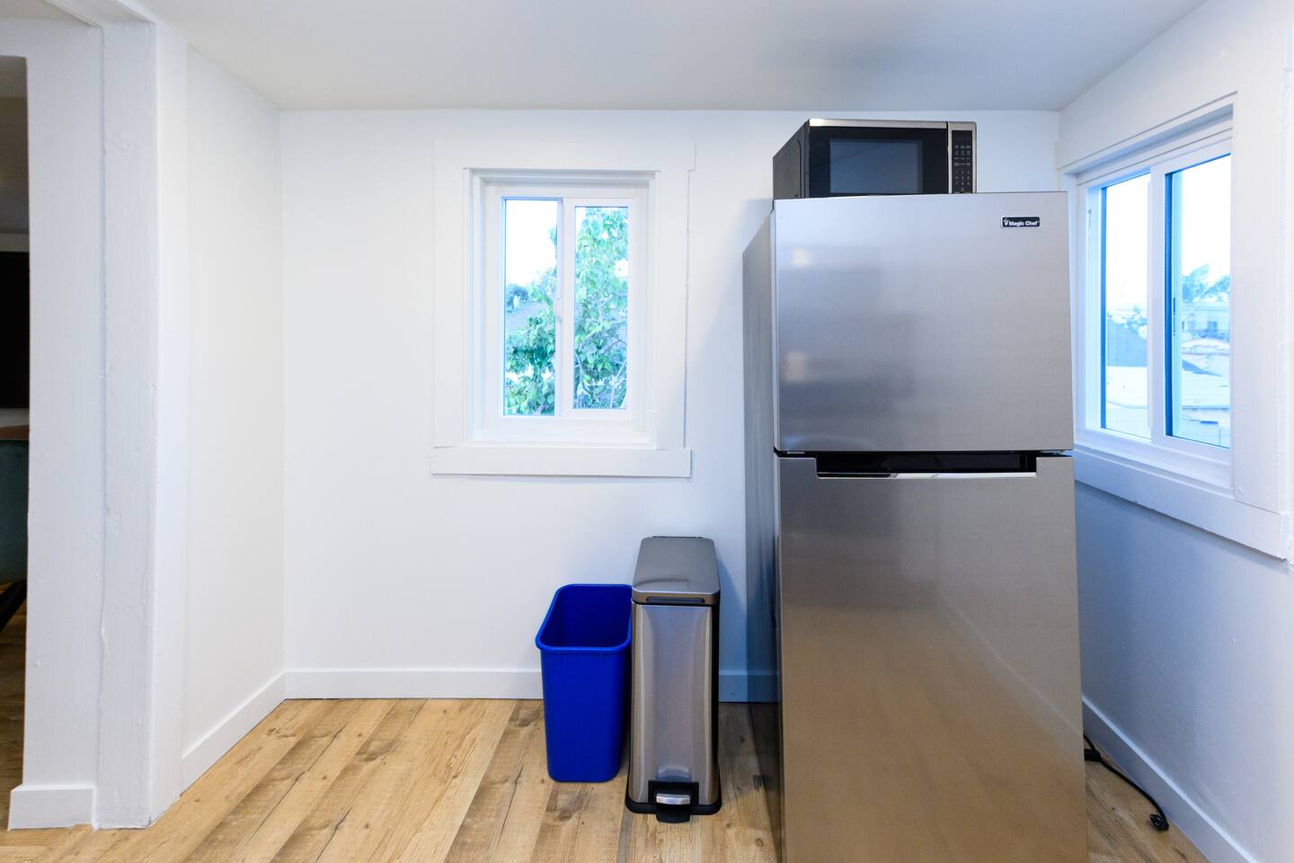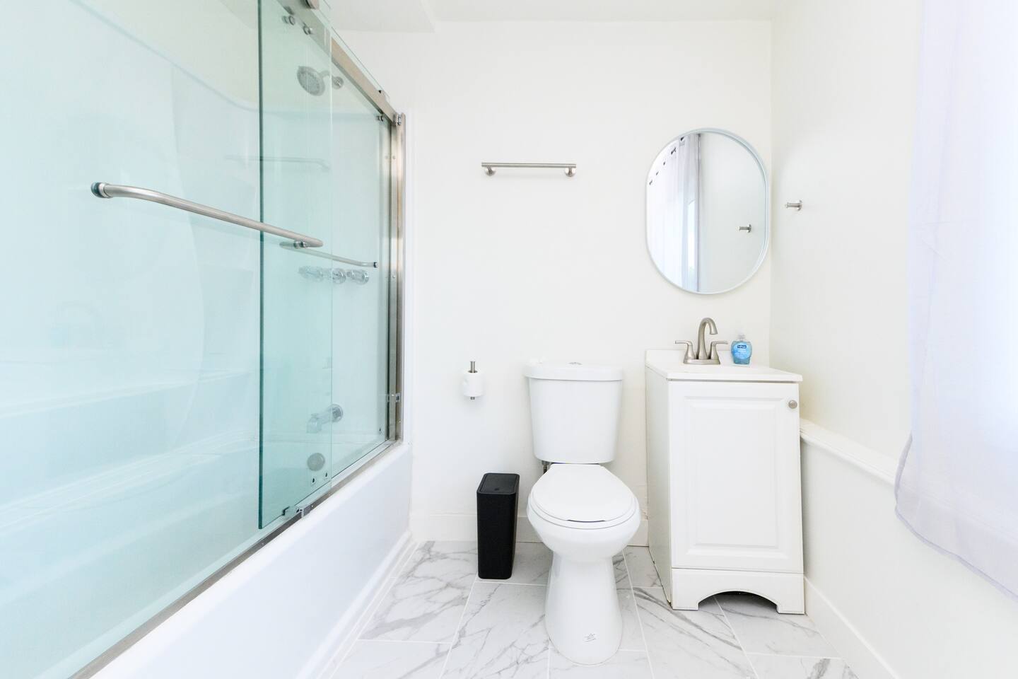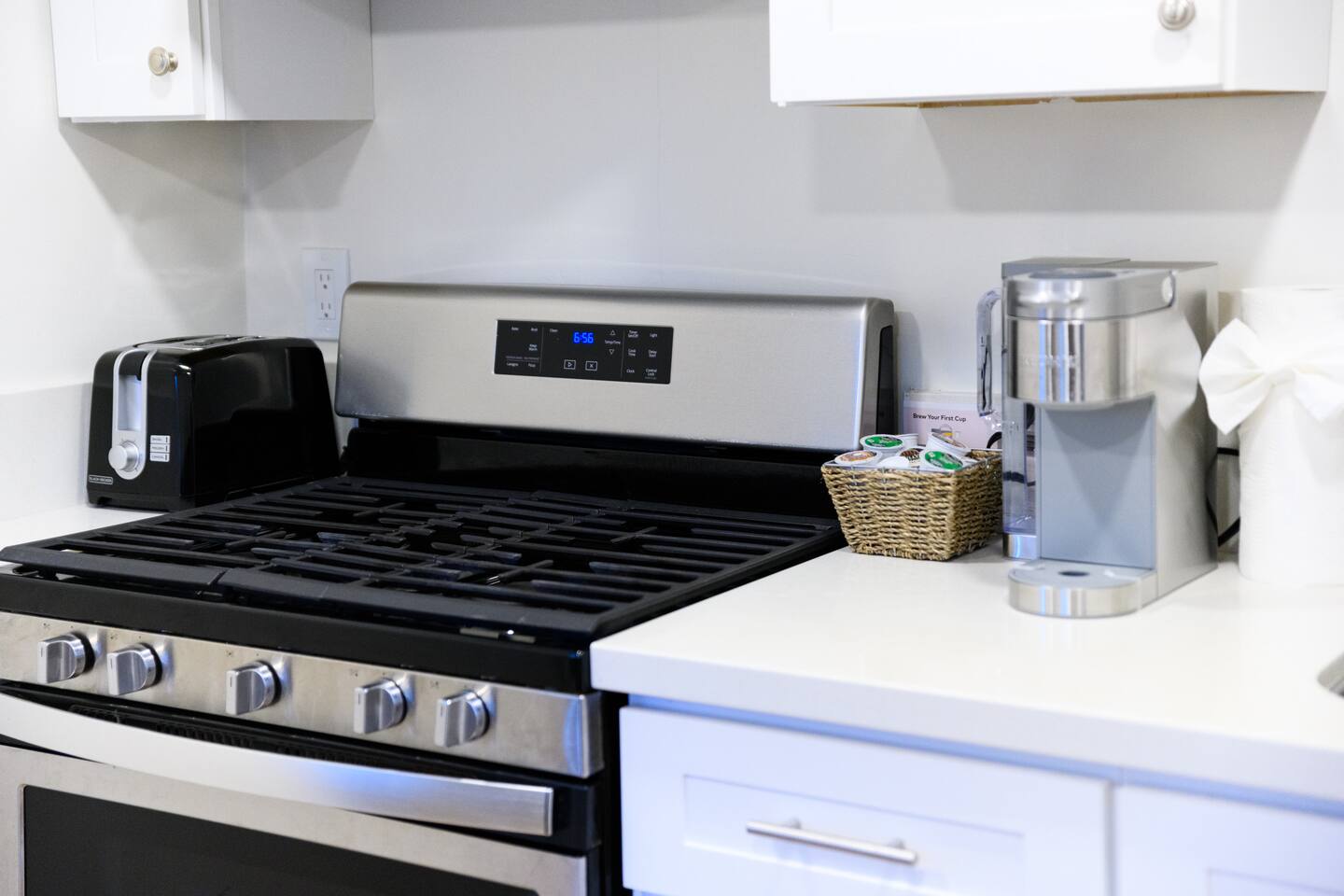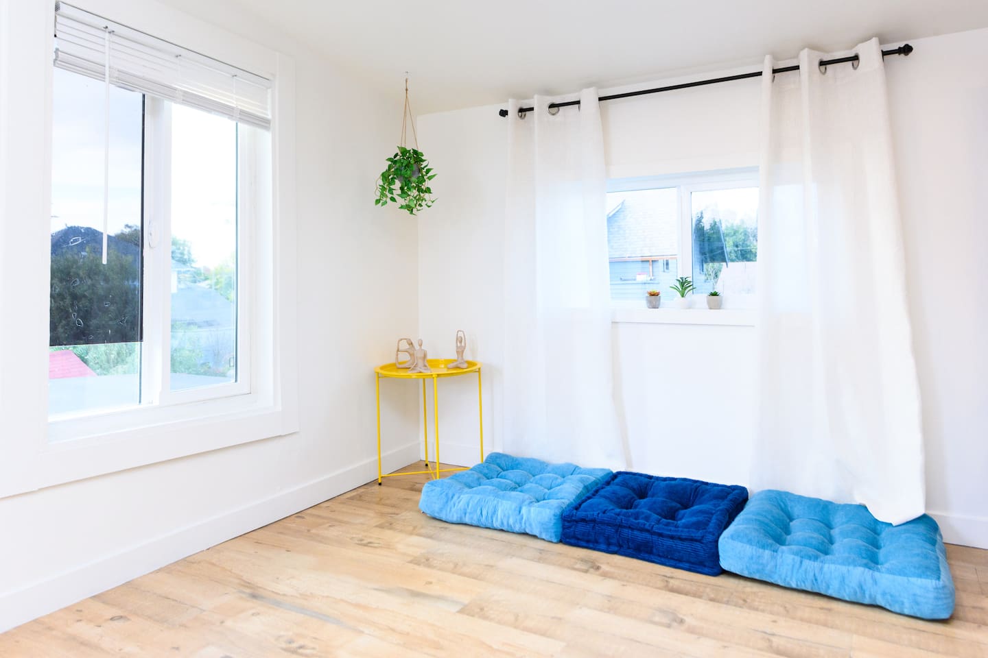 Upon entering, guests are greeted by a spacious yet cozy living space, thoughtfully designed with clean lines and a minimalist, clean aesthetic. The living room includes a large TV for your entertainment. To enable your peaceful nights of sleep, this home includes 2 plush queen beds, and a chic futon couch that effortlessly transitions from seating to sleeping space. In addition, washer and dryer are available in the unit (free of charge).