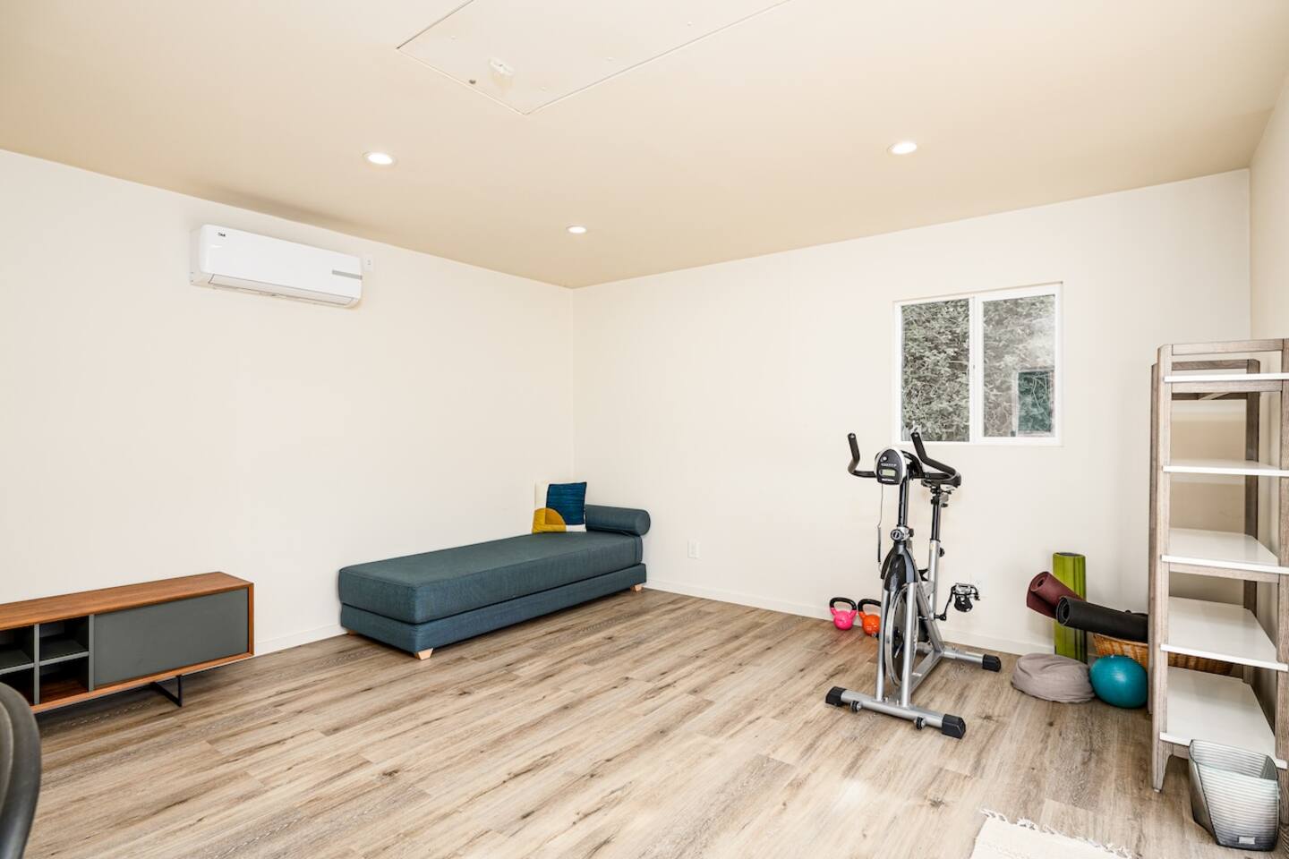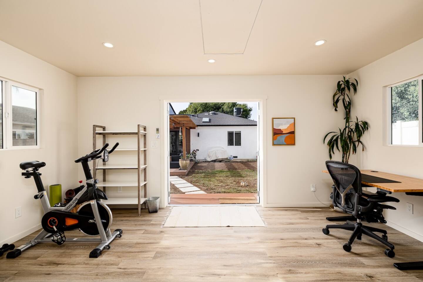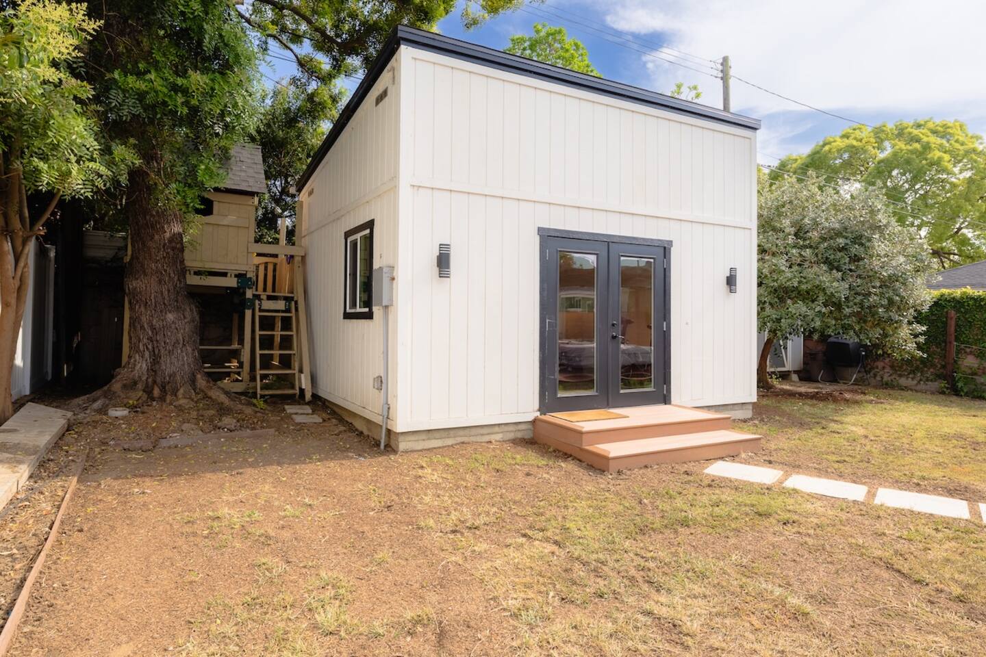 - Detached office studio in backyard with standing desk, day bed, and mini gym