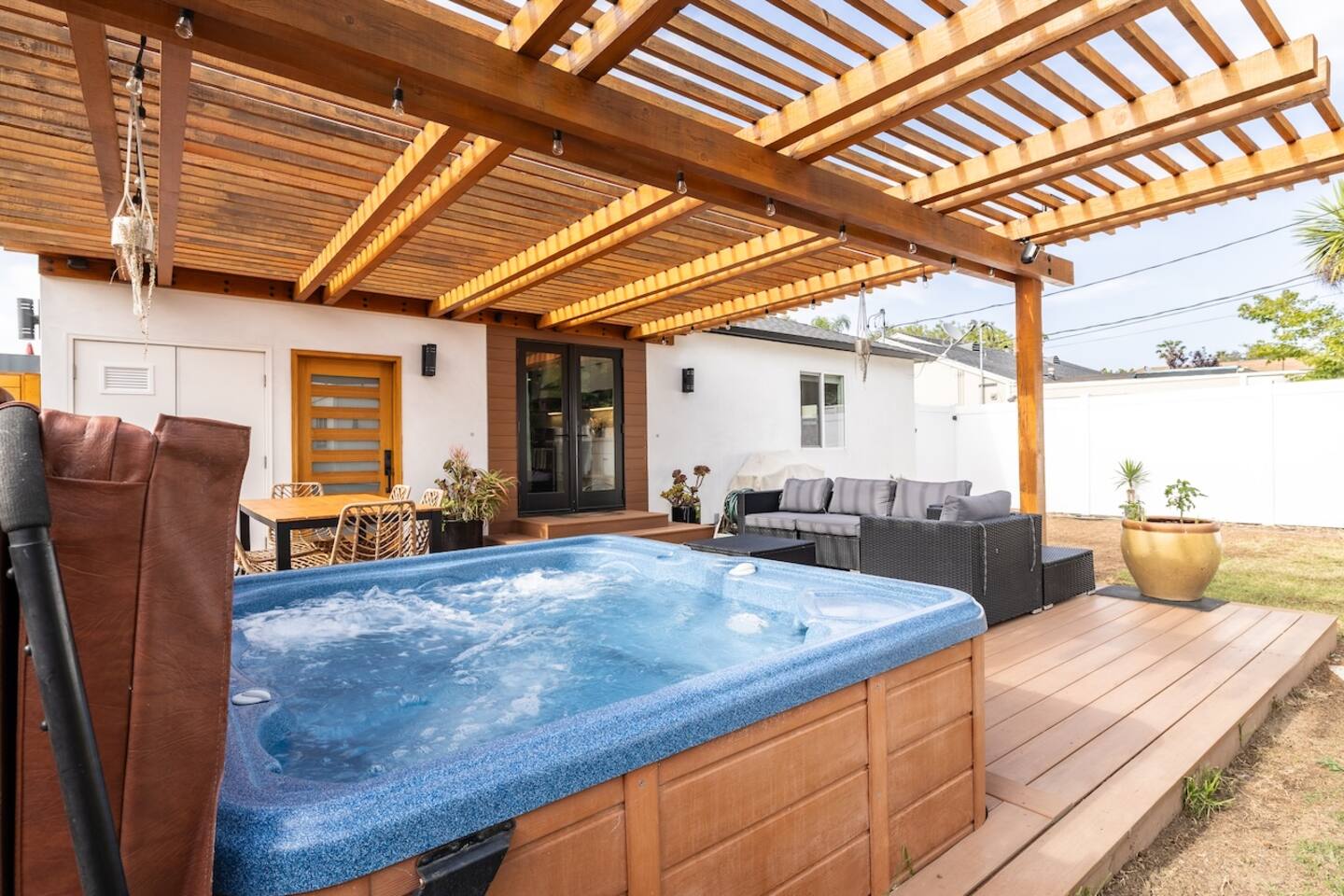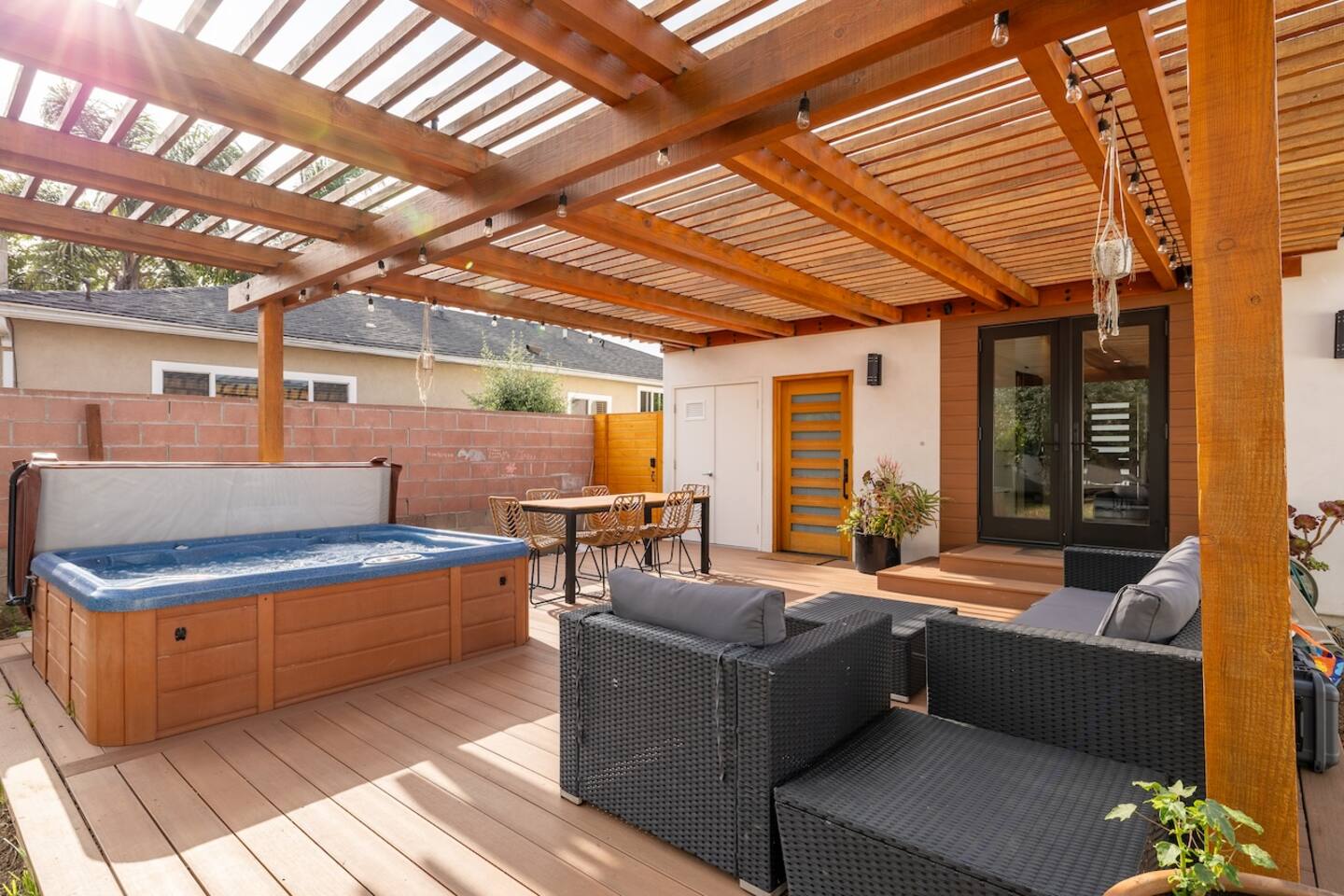 - Backyard amenities include hot tub, deck, outdoor seating, BBQ grill, and kids playhouse